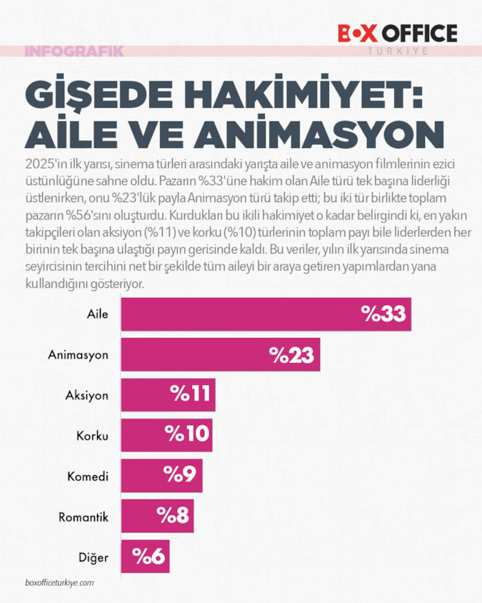 Türlerin seyirci dağılımı incelendiğinde, 2025’in ilk yarısında pazarın aile ve animasyon filmlerinin belirgin etkisi altında şekillendiği görülüyor. Toplam seyircinin %33’ü Aile– %23’ü ise Animasyon türündeki filmleri tercih etti. Bu iki tür, bir araya geldiklerinde pazarın %56’sını oluşturarak, aksiyon ve komedi gibi türlerin önünde yer aldı ve seyircinin önceliğinin ailece izlenebilecek içerikler olduğunu gösterdi.