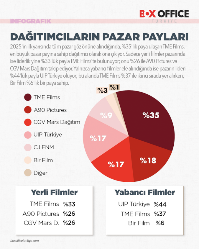 Yılın ilk yarısındaki dağıtımcı rekabeti, pazarın genel yapısını da ortaya koydu. Toplam pazarın %35’ini elinde bulunduran TME Films, hem genel pazarda hem de yerli filmler özelindeki pozisyonuyla en büyük pazar payına sahip dağıtımcı oldu. Yabancı filmlerin dağıtımında ise UIP Türkiye %44’lük payla ilk sırada yer alırken, TME Films bu alanda da ikinci en büyük oyuncu olarak konumlandı.
