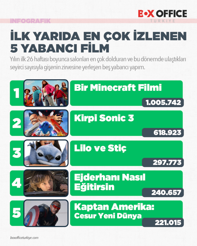Yabancı filmler listesinde Bir Minecraft Filmi1 milyon seyirci barajını aşan tek yapım olarak listenin ilk sırasında yer aldı. İkinci sırada Kirpi Sonic 3 bulunurken, Lilo ve Stiç ile Ejderhanı Nasıl Eğitirsin filmleri de listede kendilerine yer buldu. Listenin beşinci sırasında ise Kaptan Amerika: Cesur Yeni Dünya filmi yer aldı.