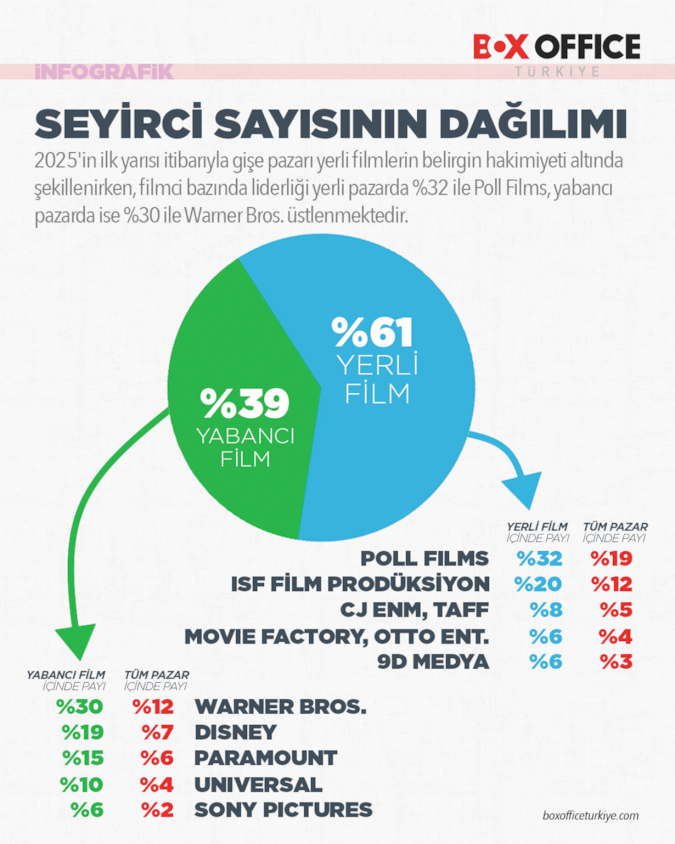 Seyirci sayısındaki genel düşüşe rağmen, pazarın yapısındaki yerli film ağırlığı devam etti. Yılın ilk yarısında seyircilerin %61’i tercihini yerli yapımlardan yana kullanırken, %39’u yabancı filmleri izledi. Yerli filmlere gelen seyircinin dağılımında pazarın %32’sini elinde tutan Poll Films Vezik %20’sine sahip olan ISF Film Prodüksiyon gibi yapım şirketlerinin rolü öne çıktı. Yabancı filmler cephesinde ise Warner Bros. yapımları ilk sırada yer aldı.